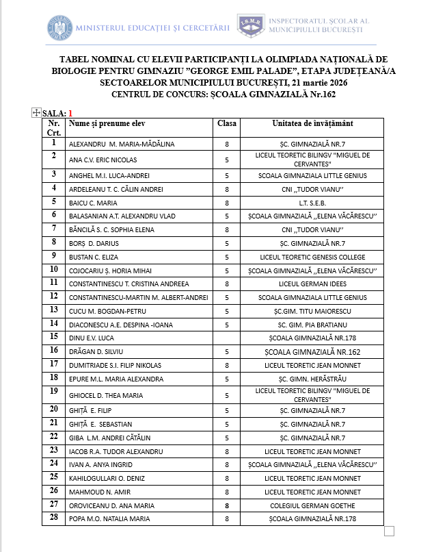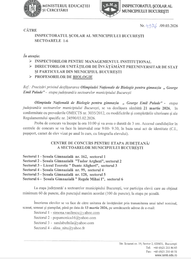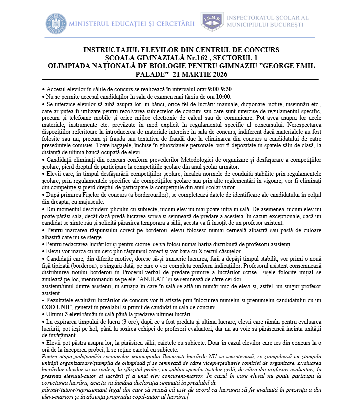 • Olimpiada Națională de Biologie pentru gimnaziu „ George Emil Palade” – etapa județeană/a sectoarelor municipiului București, se va desfășura sâmbătă 21 martie 2026, în conformitate cu prevederile OMECTS nr. 3035/2012, cu modificările și completările ulterioare și ale Regulamentului specific nr. 24590/03.02.2026.