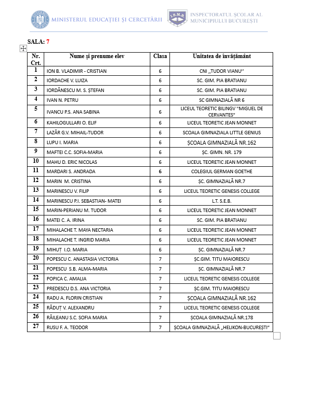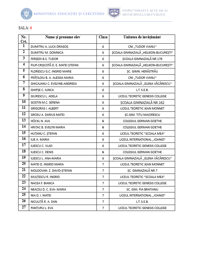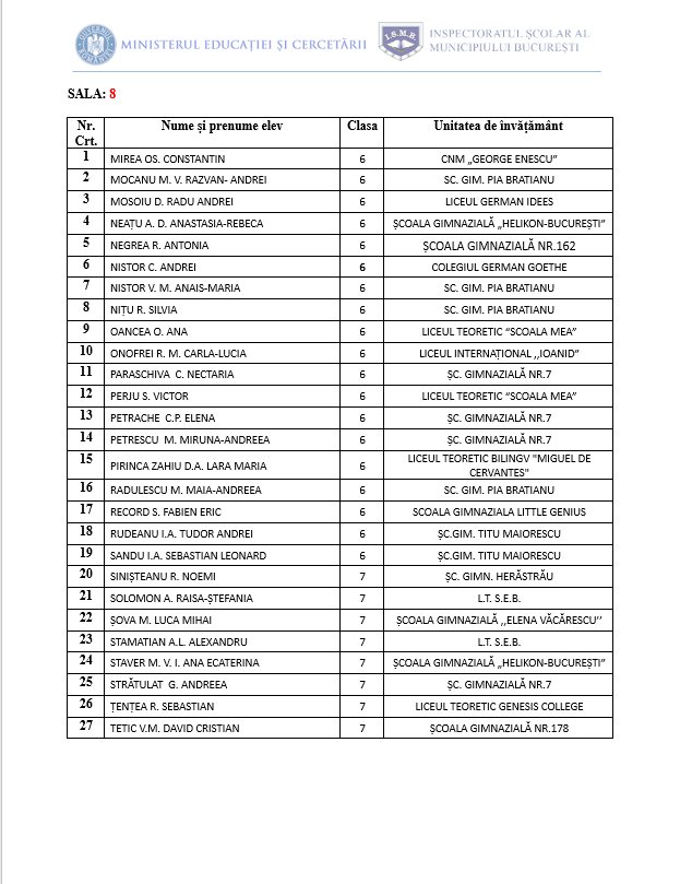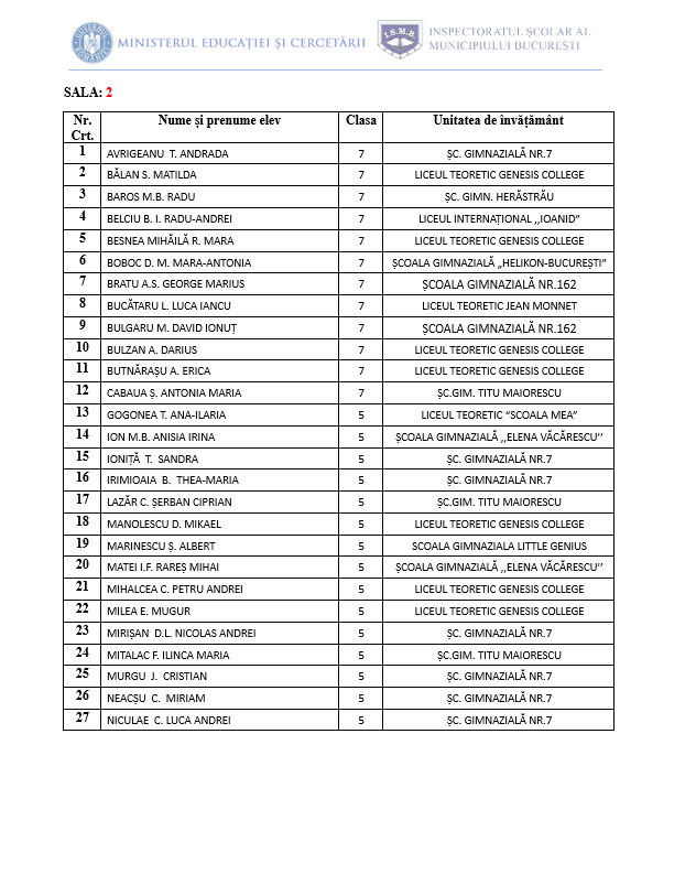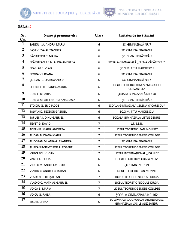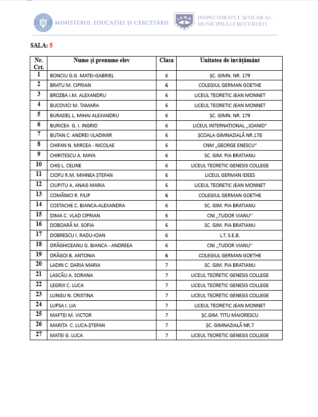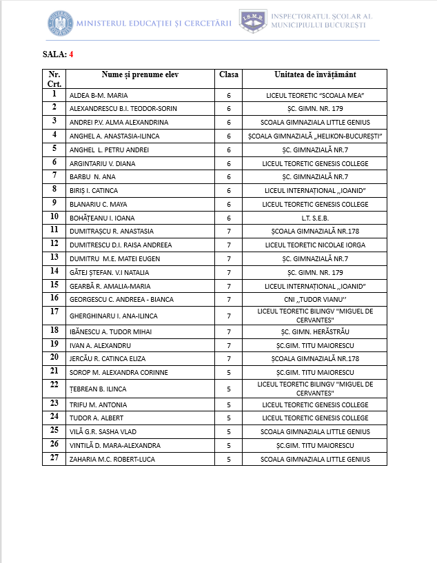 • Proba de concurs va începe la ora 10:00 și va avea o durată de 3 ore. Accesul candidaților în centrele de concurs se va face în intervalul orar 9:00- 9:30, în baza unui act de identitate (C.I., pașaport, carnet de elev vizat pe anul în curs, cu fotografia elevului).